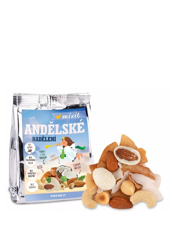 Anjelská nádielka do vrecka nepoteší iba poslušné deti, ale i relatívne poslušných dospelých. Ako hlavná hviezda tejto sezónnej limitky svietia pražené mandličky v bielej čokoláde posypané strúhaným kokosom. Prihodili sme k nim kokosové plátky – prírodné aj karamelové a zmes orieškov. Je to dobrota tak nebeská ako brnkanie harfy v obláčikoch.